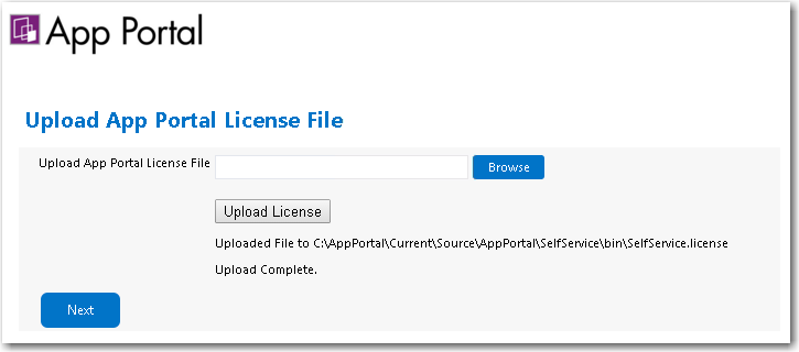 - When you launch the application for the first time, the   Upload App Portal License File   page opens.