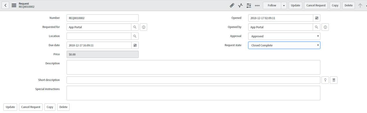 - Clicking one of the requests (REQ0010002) displays the request details. If the status is  Success  in App Portal, the  Request State  displays as  Closed Complete .