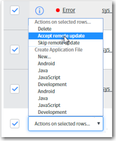 9. To resolve an error, select it, open the Actions on selected rows... menu at the bottom of the screen, and click Accept remote update .