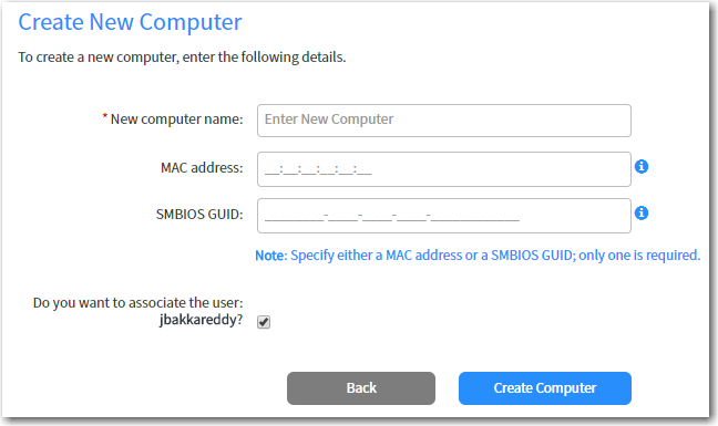 - Enter either the MAC address or SMBIOS GUID of the new computer. Only one value is required.