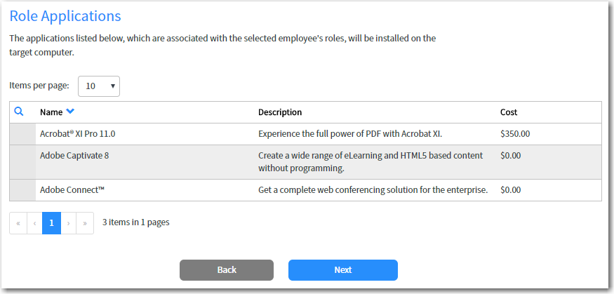 - Click Next . The Role Applications panel opens, listing the applications that are associated with the selected employee’s roles, which will be installed on the target computer.