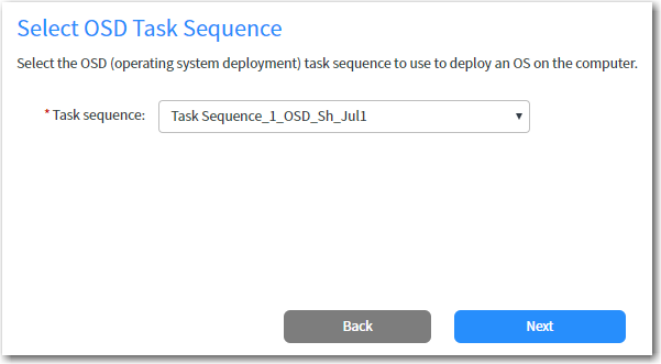 - From the Task sequence list, select the task sequence corresponding to the OS you want to deploy, and then click Next . The Create New Computer panel opens.